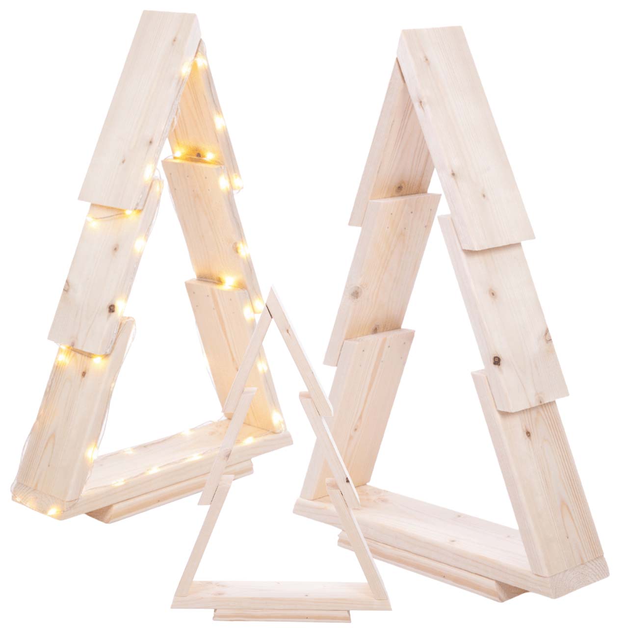 Po sezonie świątecznym choinka zajmuje niewiele miejsca, dzięki czemu jej przechowywanie jest proste i wygodne. Produkt stanowi część większej kolekcji – dostępne są również zestawy trzech choinek w różnych wysokościach, które razem tworzą efektowne, wielopoziomowe aranżacje. Lampki widoczne na przykładowych zdjęciach nie są elementem zestawu, ale można je dokupić osobno w pozostałych ofertach, tworząc spójną drewnianą dekorację świąteczną dopasowaną do własnych potrzeb.